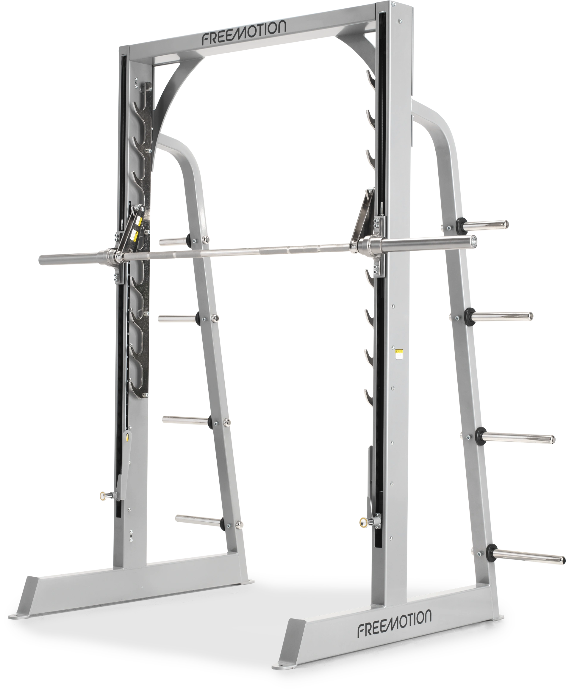 By eliminating the crossbar, Freemotion has created an easy walk-in/workout tool that helps members get results. The EPIC Smith Machine has a 82.5 in (209.5 cm) bar height and 51 in (129 cm) squatting and pressing range to fit people of all sizes. Built-in safety stops ratchet the barbell into place before and after each lift while plate holders near the bar racks make loading and unloading easy and also create convenient storage space.