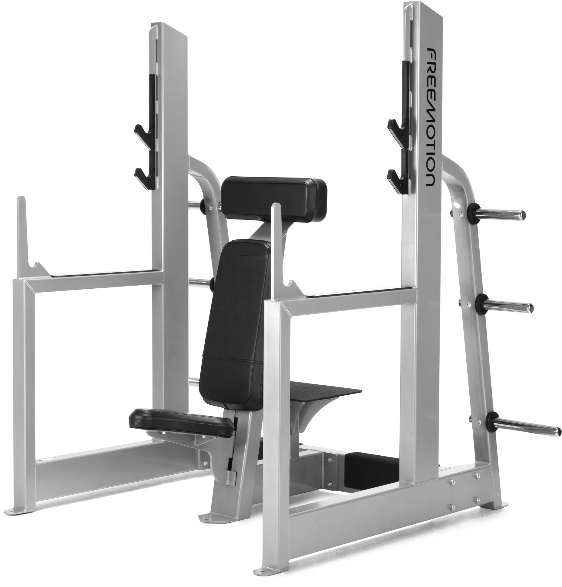 For maximum bar clearance, the Military Press was designed with 1 front rack and 2 rear racks. The bar racks feature molded covers for added durability and reduced wear. They were built and placed at an extended width to accommodate wide hand positions.