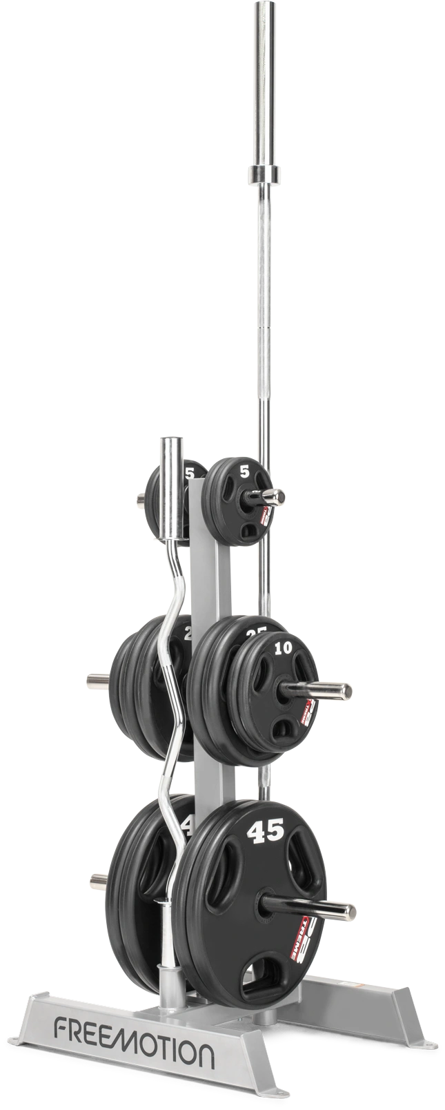 With flared edges to help with bar placement, this Freemotion rack holds two Olympic-sized straight and/or curl bars.