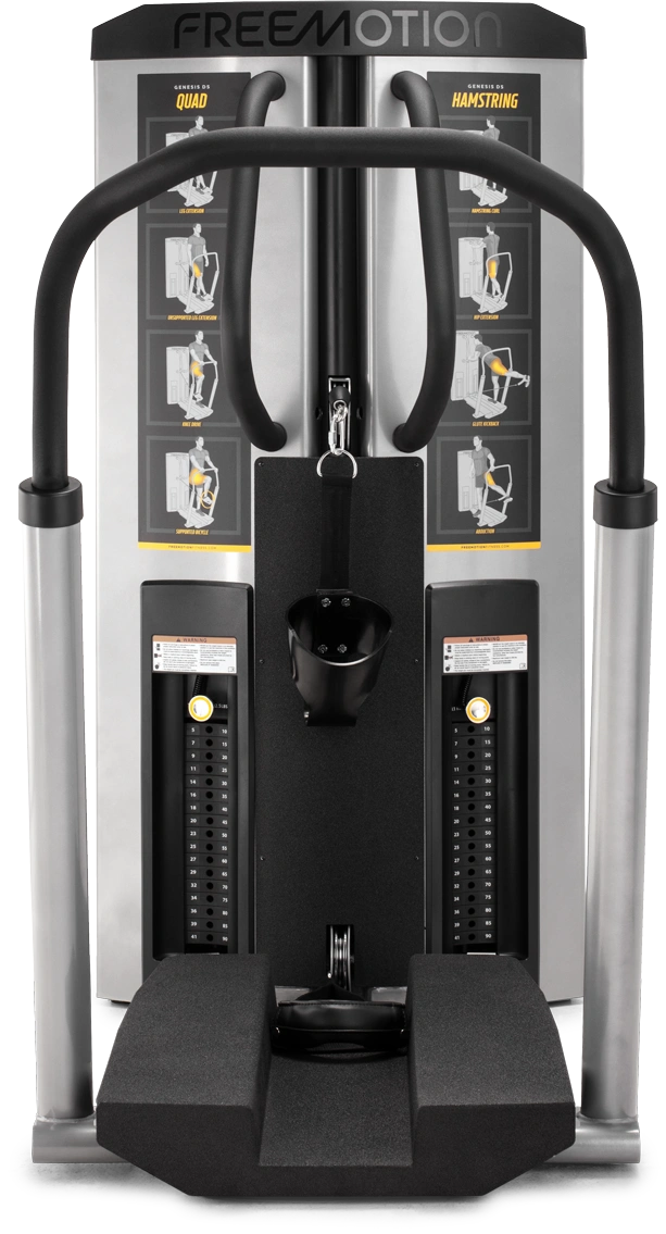 Engage multiple muscles and unlock explosive leg power with the Genesis DS™ quad/hamstring machine. This machine functionally trains the leg muscles to work together to increase power, stability and joint protection for everyday life activities. Each leg movement utilizes cable-based training with innovative swivel pulley design to provide full exercise flexion and targeted muscle training. Vertical handles and the large textured Line-X® platform provide excellent grip and stability.