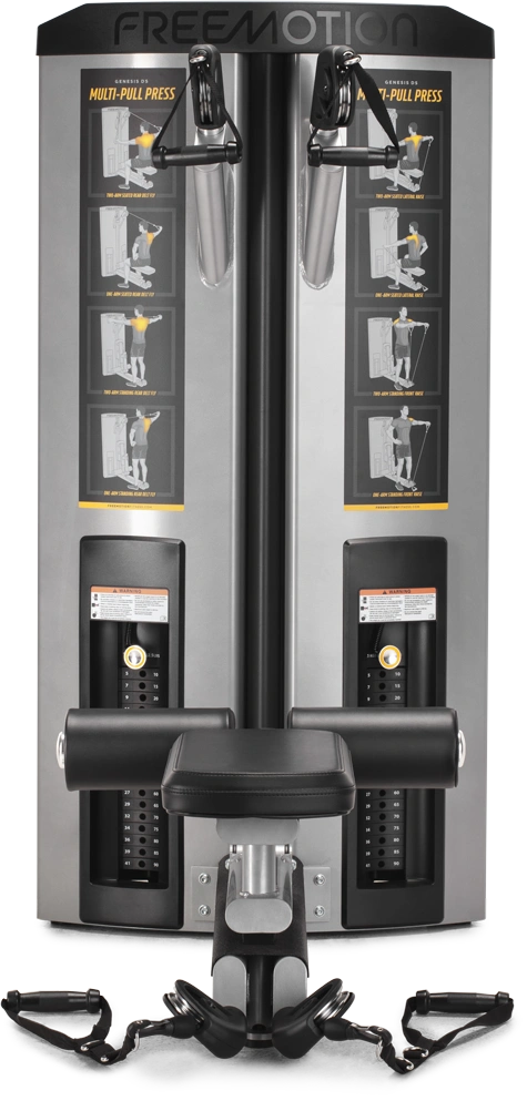 Strengthen forearms, shoulders, chest and neck with the versatile Genesis DS™ Multi-Pull Press machine. Utilizing cable-based training with convenient, interchangeable snap-clip aluminum swivel pulleys—the Freemotion Multi-Pull Press machine targets specific arm muscles from a seated or standing position. An adjustable thigh pad comfortably secures legs throughout the workout while the padded, pivoting seat pad quickly folds up and away to switch between seated and standing positions.