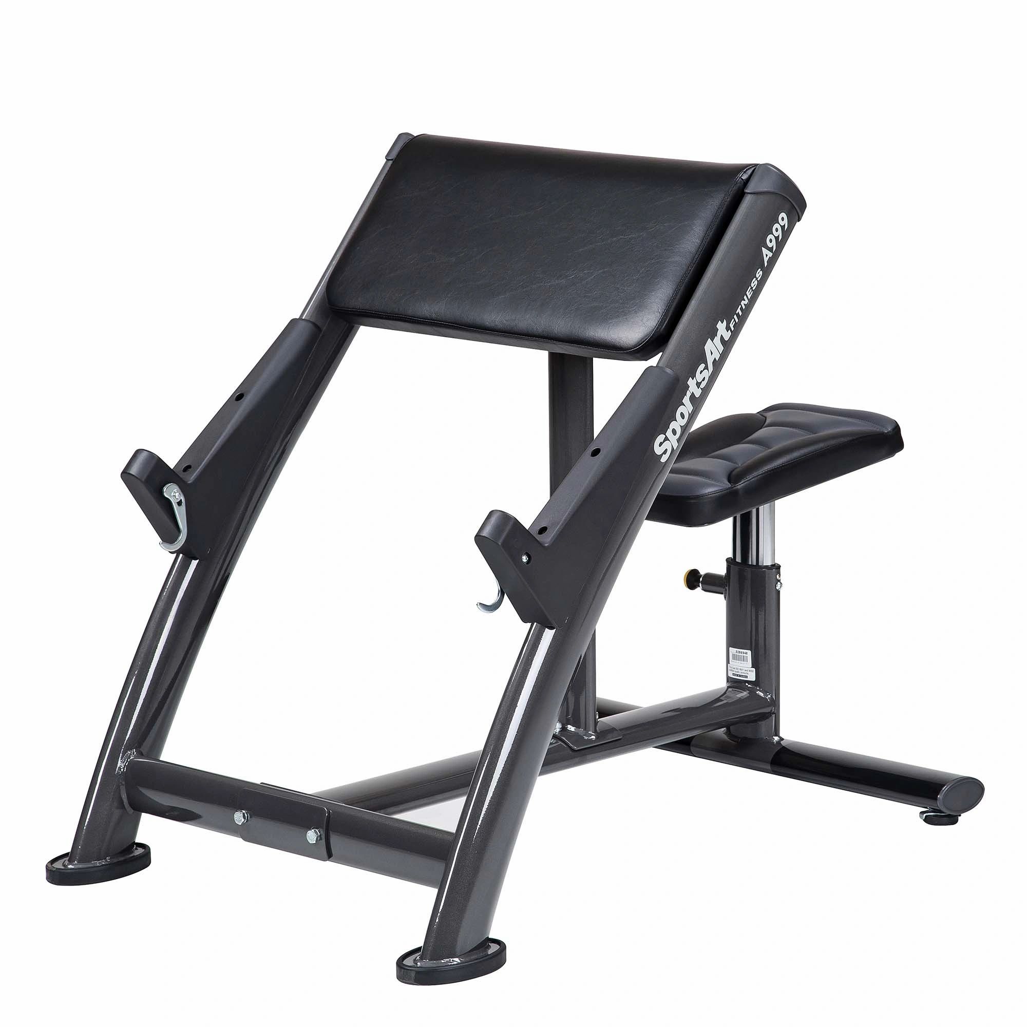 This Preacher Curl Bench from SportsArt helps focus you on isolating your biceps using free weights or dumbbells.