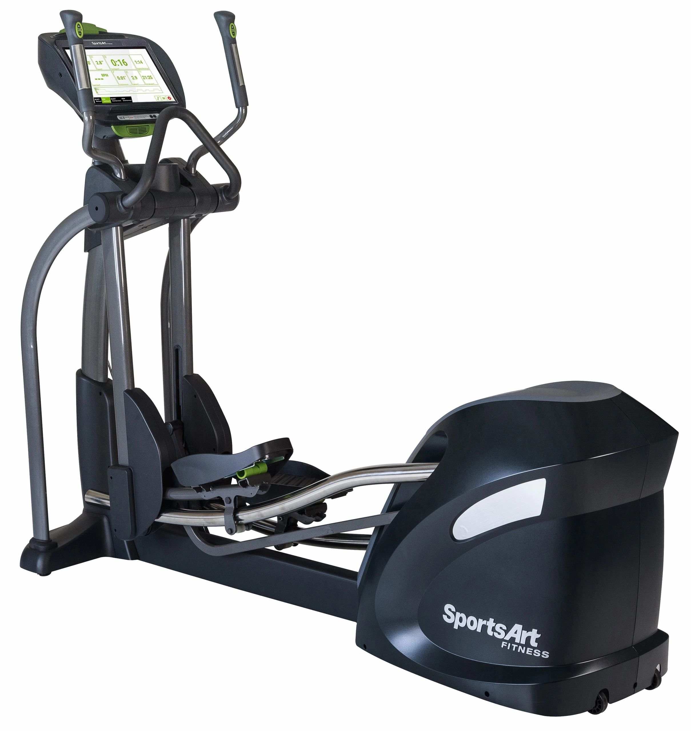 SportsArt ellipticals are the perfect option for exercisers looking for a total body, low-impact workout. The contact heart rate is standard and a wireless Polar® HR receiver is built in, multiple language options are included (English, Spanish and French) and a 3-speed fan keeps users cool.